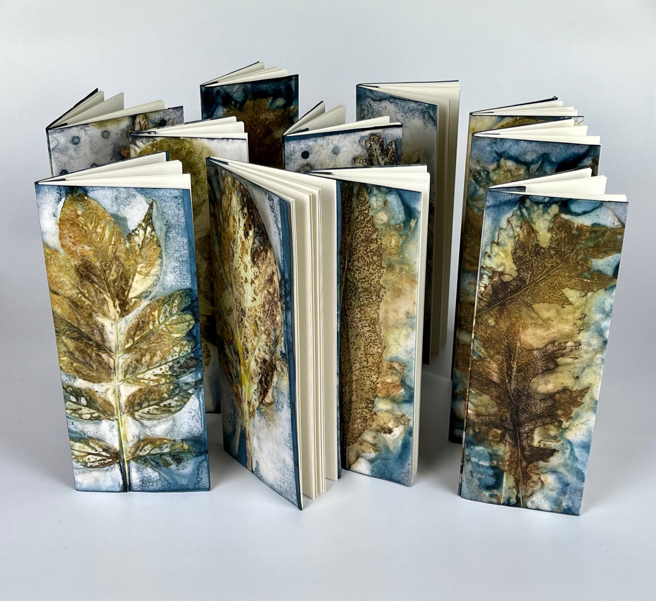 Using leaves and plant material in eco printing on both paper and fabric also forms part of her current practice. Leaves are collected from her garden and the local area and the outcome is a wide variety of wall art, handmade books and vessels.